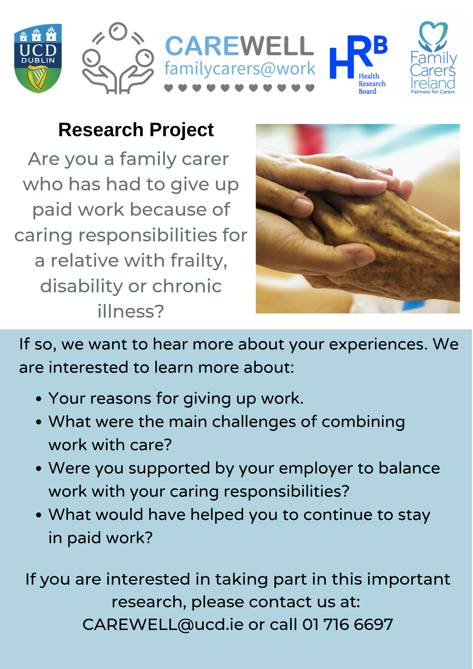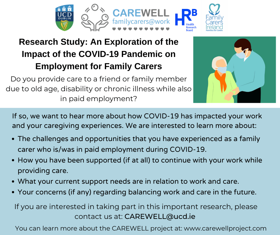 We are currently seeking to recruit participants. If you, or anyone you know would like to take part, please get in touch by emailing us at carewellproject@ucd.ie. Please feel free to share the study details with anyone who might be interested.