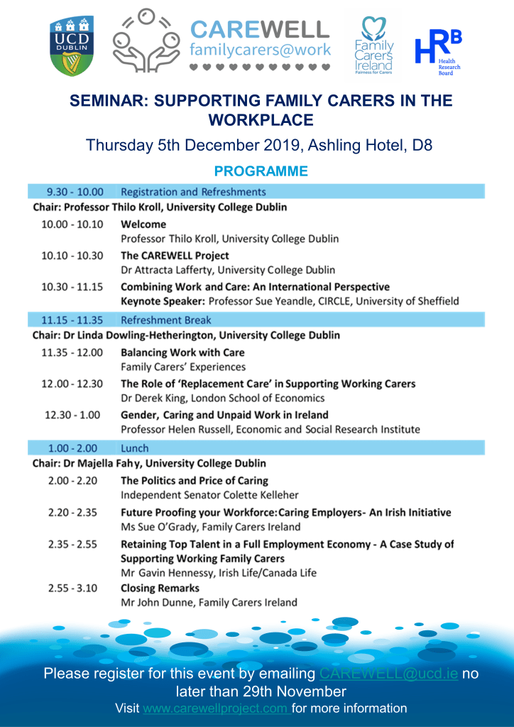 With funding from the HRB Conference and Event Sponsorship Scheme, the CAREWELL team will host a stakeholder event on Thursday 5th December this year. This one-day seminar will highlight the importance of supporting family carers in the workplace. Professor Sue Yeandle, Director of CIRCLE, Centre for International Research on Care, Labour and Equalities, University of Sheffield, UK is keynote speaker and will present on ‘Combining Work and Care: An International Perspective‘. A range of stakeholders, including CAREWELL collaborators are invited to the event. Places are limited, so please register here or by emailing carewell@ucd.ie.