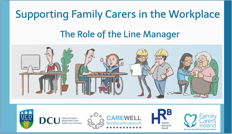 Drawing on the research findings from the CAREWELL project, we produced a video to raise awareness of ‘The Role of the Line manager in Supporting Family Carers in the Workplace and to highlight how line managers can provide effective support to family carers. The video explains who we mean when we talk about ‘family carers’, the challenges they experience when balancing work with care, and how they can be best supported by their line manager. Four scenarios are presented to illustrate the different ways family carers have been supported in the workplace to combine work and care.